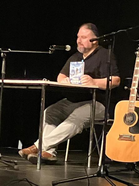 Musikalisch eingestimmt wurden die Gäste von Willi Esser, der mit dem zur Jahreszeit passenden Titel Fresenhof von Knut Kiesewetter die richtige Atmosphäre schuf. Danach eröffnete Sascha Vennemann den Abend und stellte sein neues Buch Frozen Metropolis – Ein Permafrostroman vor. In naher Zukunft, so der Autor, stürzt die Welt ins Chaos: Der Mond gerät aus seiner Umlaufbahn, die Gezeiten spielen verrückt, Naturkatastrophen verwüsten die Kontinente – eine neue Eiszeit bricht an. In den Ruinen der einstigen Megacity Metropolis kämpfen die Menschen ums nackte Überleben.