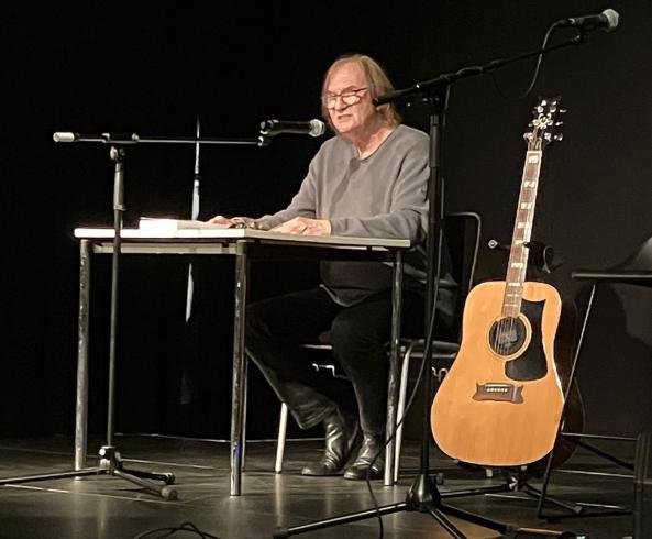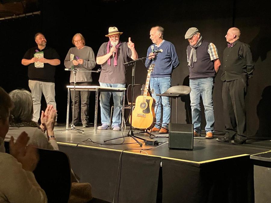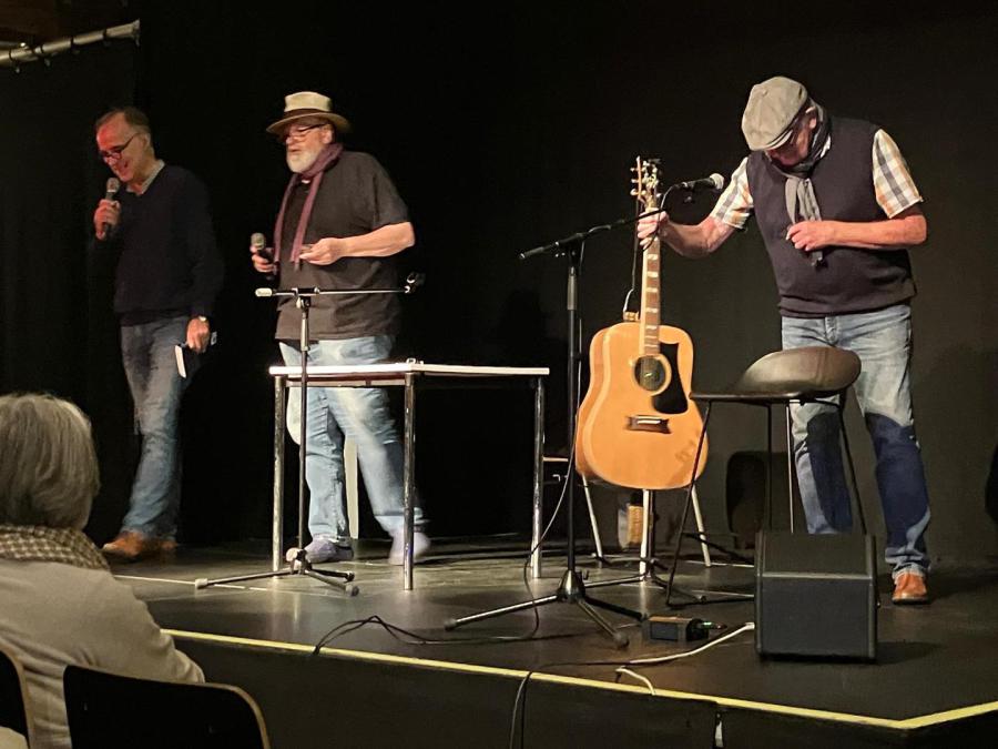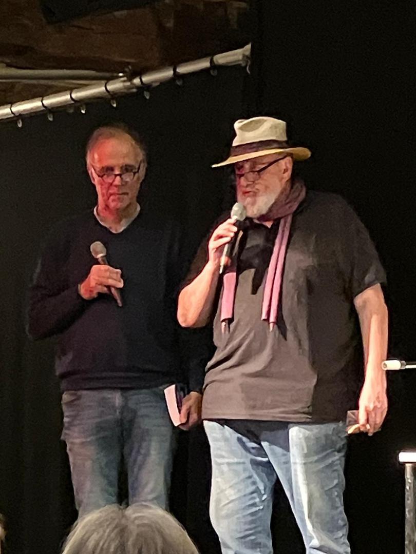 Nach der Pause traten die Gastgeber selbst ans Mikrofon. Mathias Meyer-Langenhoff ließ seine pensionierte Lehrerfigur Alex Wittig erkennen, dass Reisen mit dem Camping-Caravan nicht immer reine Erholung bedeuten. Martin Liening griff in einem Gedicht humorvoll die Diskussion um die EU-Vorgabe auf, Begriffe wie „Wurst“, „Steak“ und „Schnitzel“ künftig nicht mehr für vegane oder vegetarische Produkte zu verwenden. Es folgte ein Text, mit dem Titel Alles in Allem / ein Chatsalatgedicht mit Cut, in dem er die klasssiche Messengerkommunikaion aufs Korn nahm.